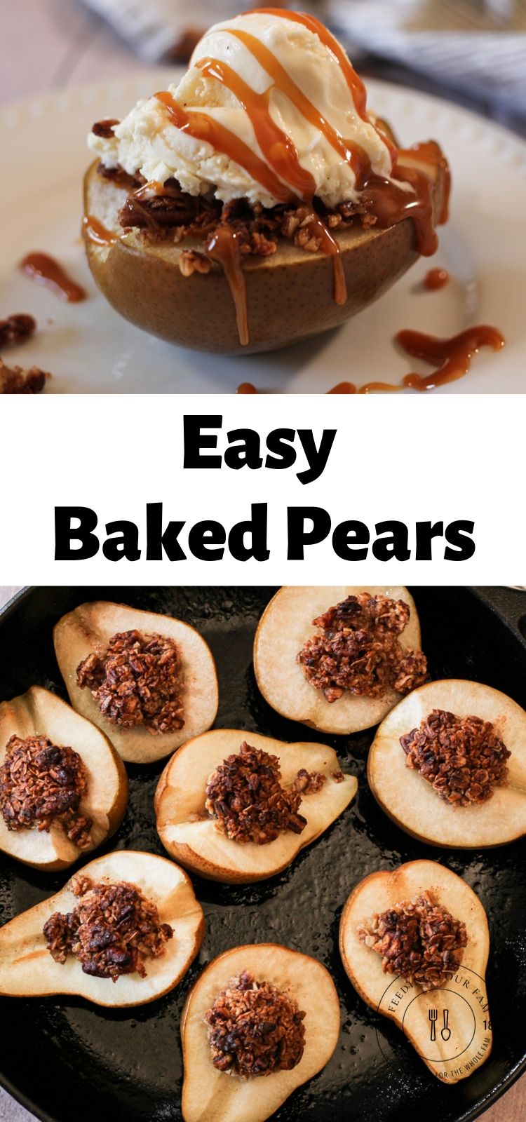 This simple Baked Pear Recipe takes sweet pears and tops them with a honey, oat, pecan topping that ‘pairs’ perfectly. Add a scoop of ice cream and caramel for an easy baked pear dessert.