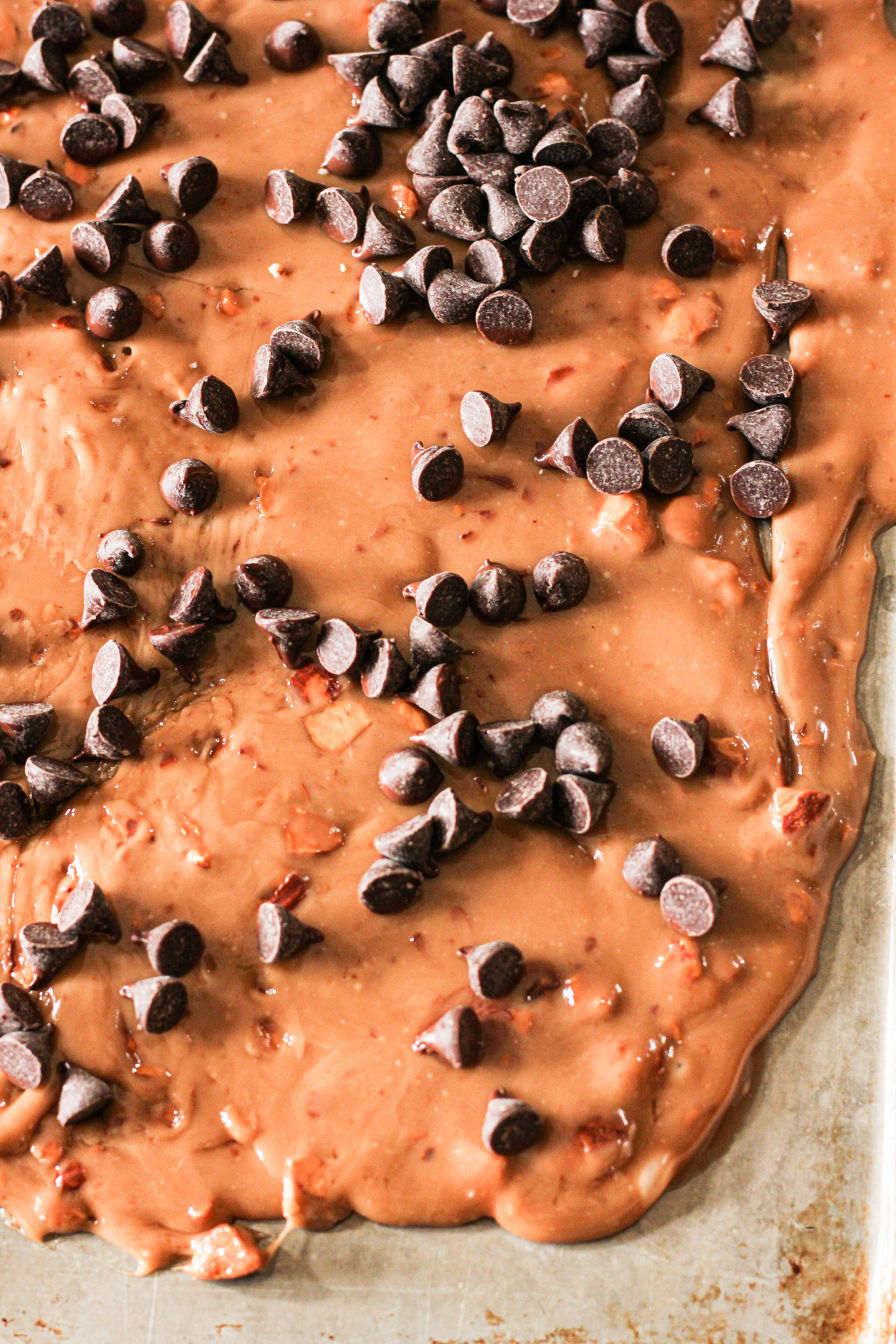 Once removed from the pot, the toffee will begin to harden quickly. While the toffee is still warm, place chocolate chips on top. They will melt from the heat of the toffee.