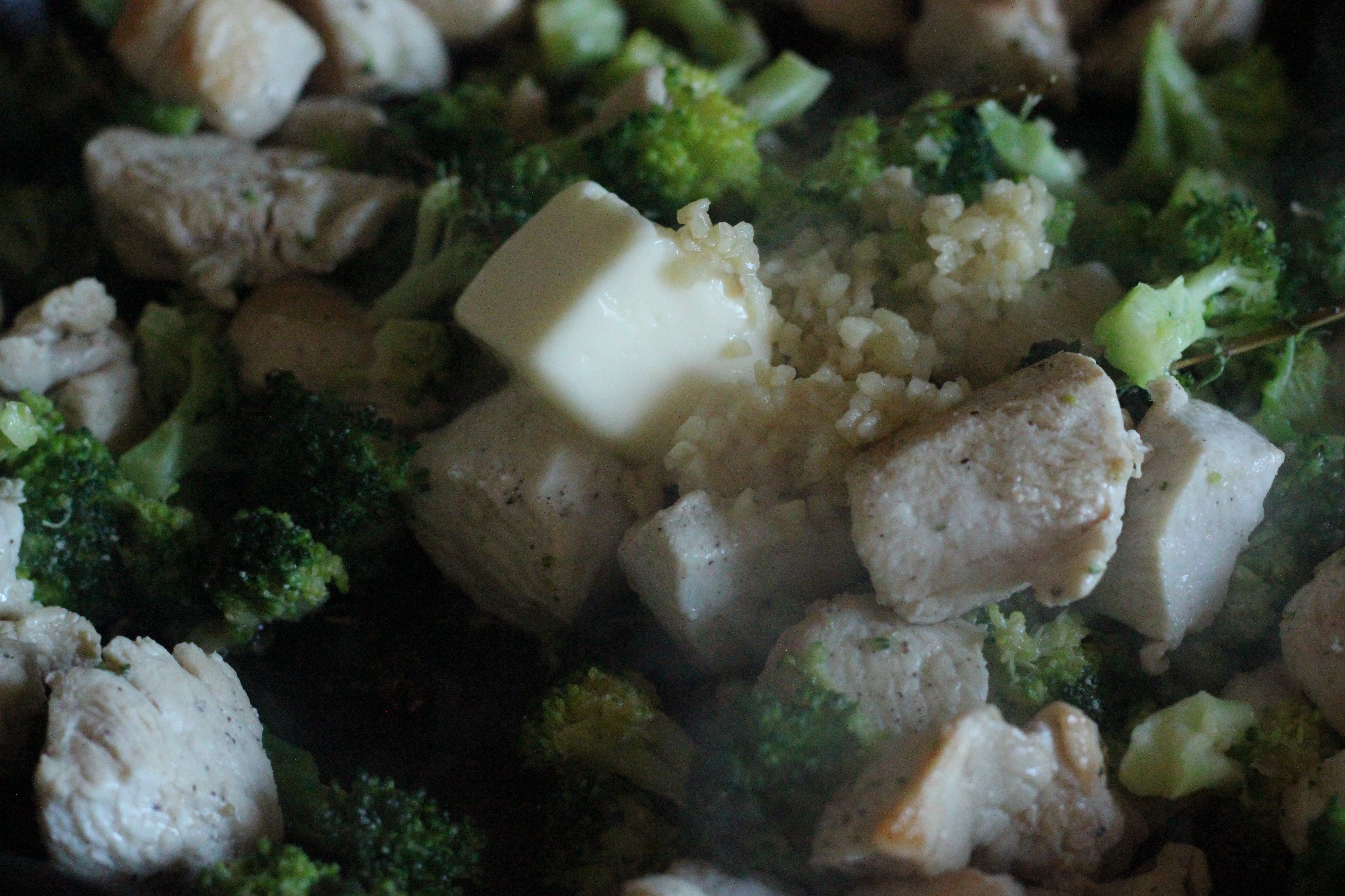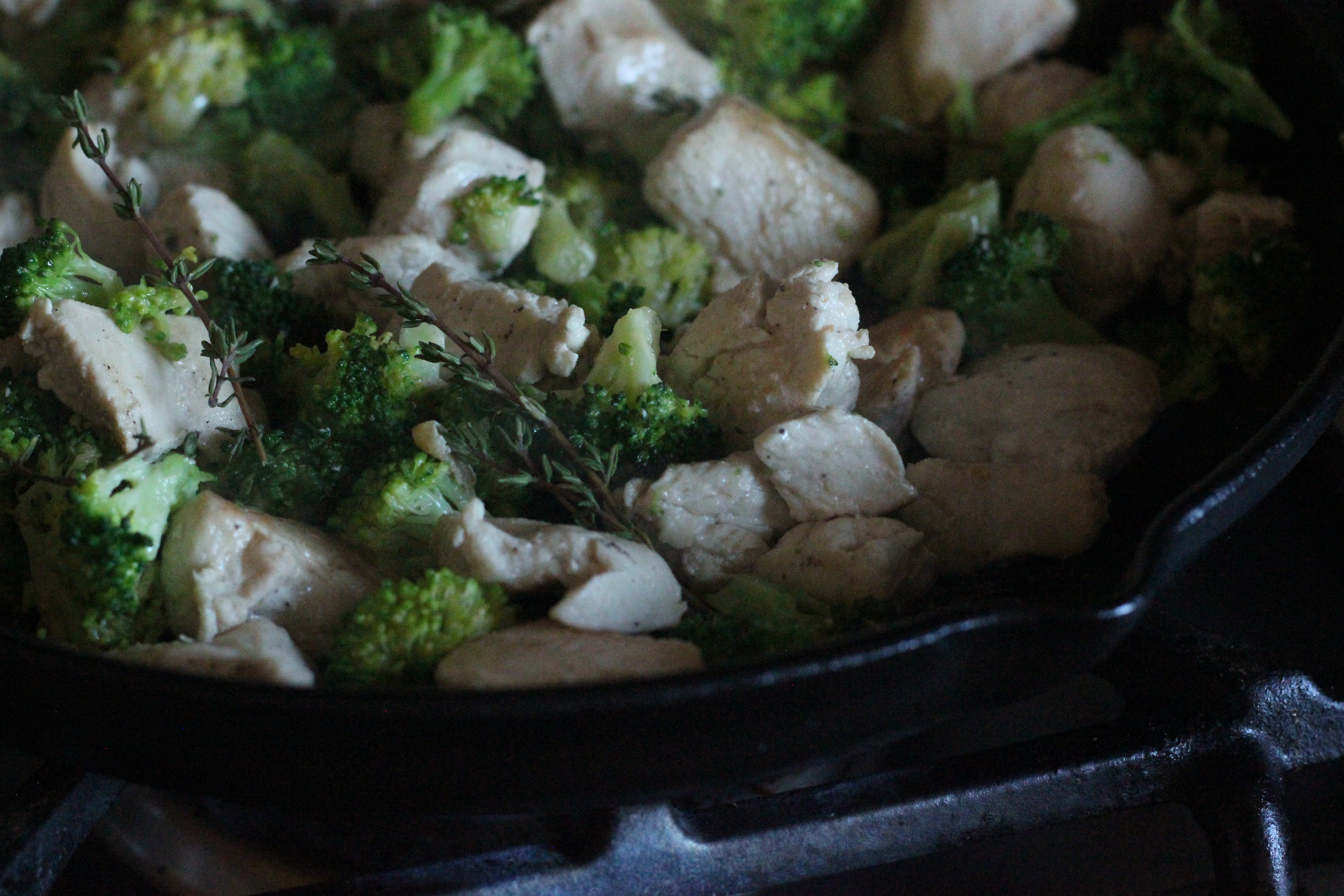 This is one of those meals you can have ready and on the table in under 30 minutes!! Start with browning the cubed chicken in a hot skillet with oil. Cook until browned, then add in the broccoli, thyme and 2 tablespoons of water and allow to cook for 5 minutes until broccoli is just tender.