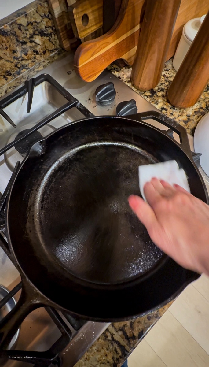 Lastly, place your cast iron back on the burner over medium heat to get it completely dry and pour a small amount of oil (canola, vegetable, or avocado) into the skillet. Carefully rub the oil all over the pan with a paper towel.