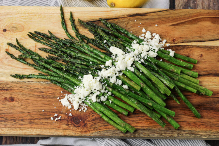 We love to serve this asparagus recipe with a sprinkling of feta cheese, it is SO good. If you are not a fan of feta, you can leave the cheese out all together or try something more mild such as parmesan.