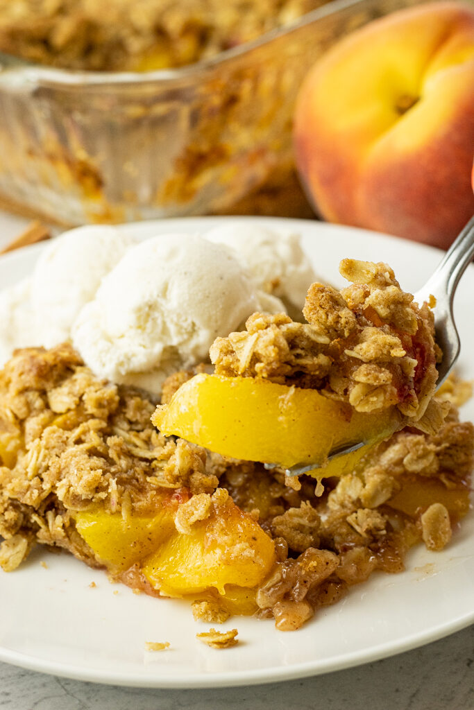 Peach Crisp is one of our favorite recipes to use fresh peaches in, especially during the summer when they are cheap and in season.