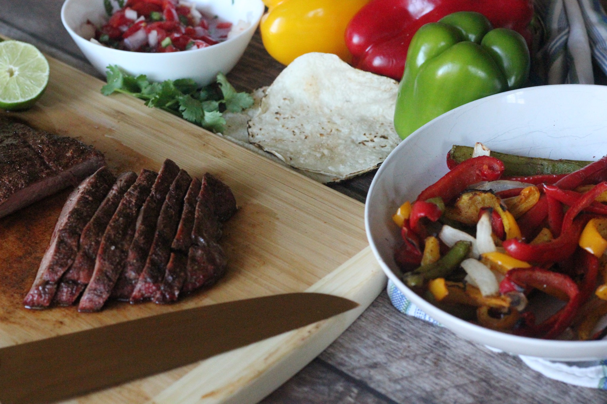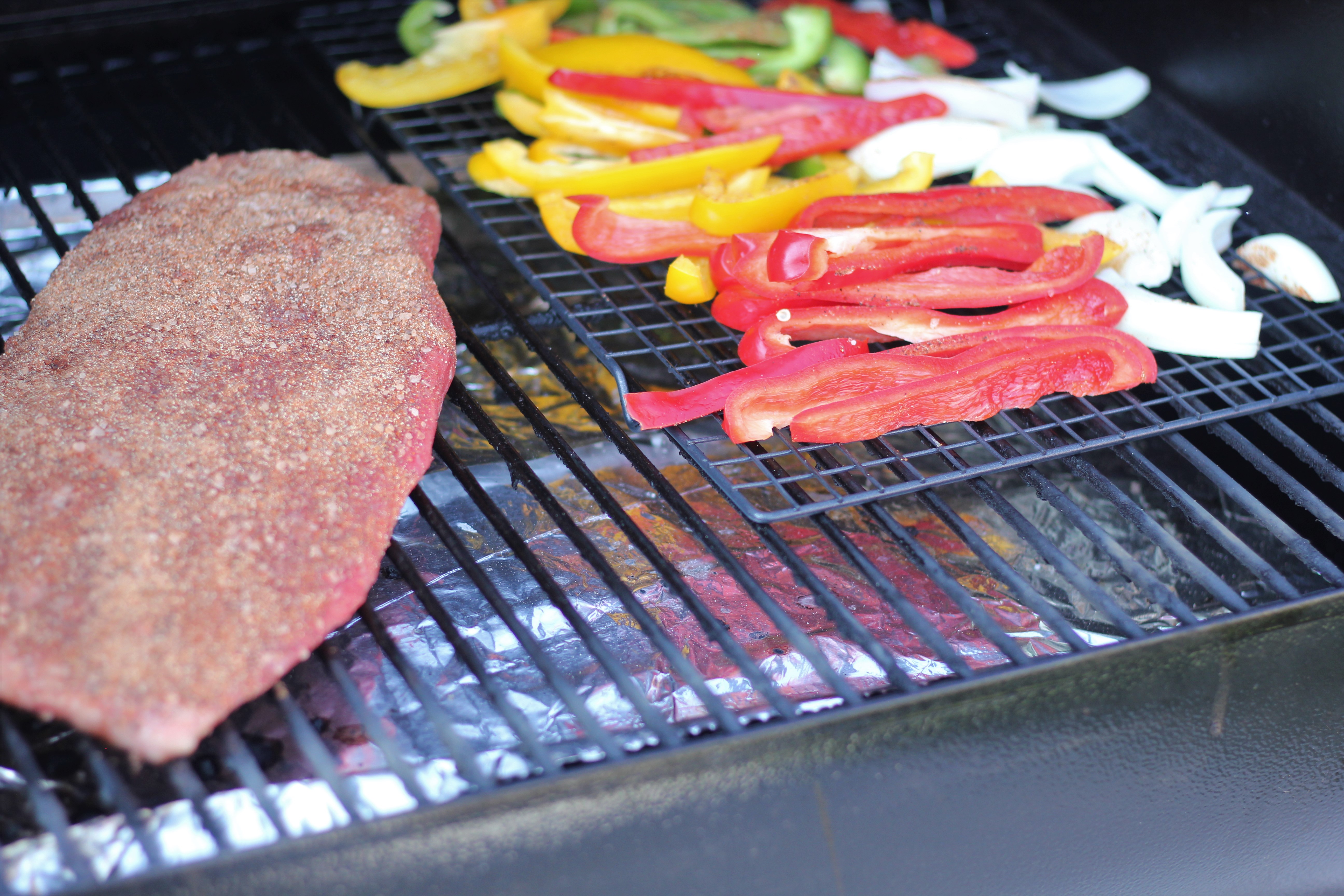 - Liberally rub the flank steak with spice rub on both sides, gently patting to help the spices stick. Sprinkle the sliced peppers and onion with olive oil, then with spices.